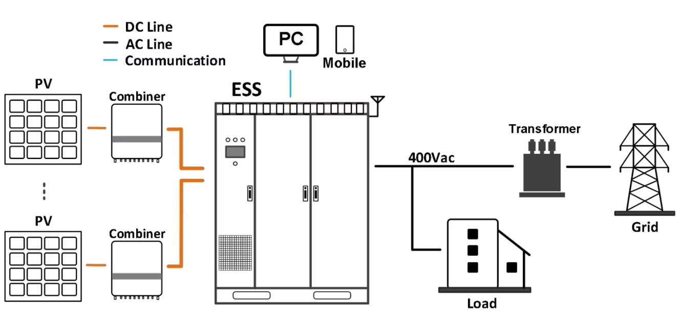 Noyau unifié d'alimentation et de stockage : Le système comprend un noyau étroitement intégré Système de conversion de puissance (PCS) et un banc de batteries haute tensionCela élimine les problèmes de compatibilité externe et réduit le temps d'installation de plusieurs semaines à quelques jours. Choisissez entre un onduleur bidirectionnel de 105 kW ou 125 kW, pré-synchronisé avec une batterie LiFePO4 évolutive pour une capacité d'énergie utilisable de 215 kWh, 233 kWh ou 261 kWh.
