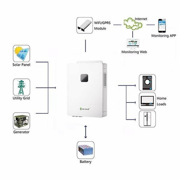 Cet onduleur solaire prend en charge une entrée PV à deux canaux avec MPPT simultané pour la capacité de charge/transport, offre quatre modes de charge, dont PV uniquement, secteur en premier, PV en premier et secteur + PV, comprend des fonctions de charge et de décharge programmées pour réduire les coûts d'électricité en fonction des tarifs heures pleines/heures creuses, dispose d'un mode d'économie d'énergie pour réduire les pertes à vide, fournit deux modes de sortie pour une alimentation sans interruption, met à jour les données du système de manière dynamique via un écran LCD, assure une protection complète contre les courts-circuits, les surintensités, les surtensions, les sous-tensions et les surcharges, et facilite la communication via les interfaces CAN, USB et RS485.