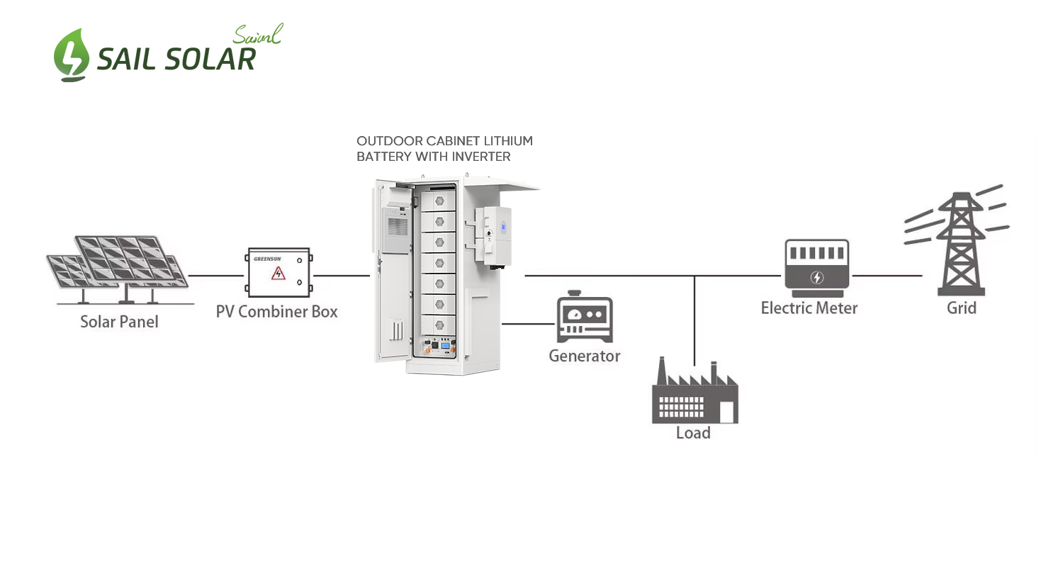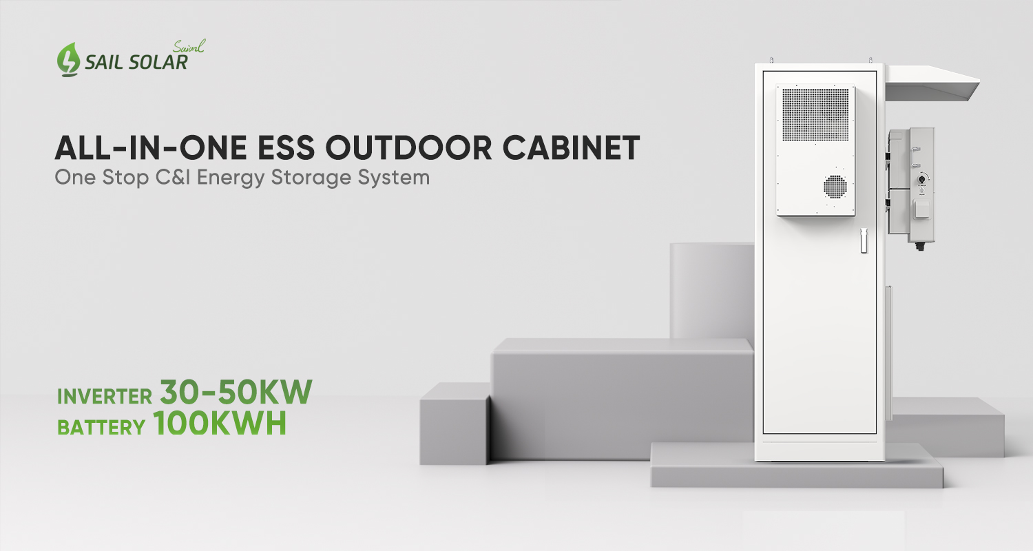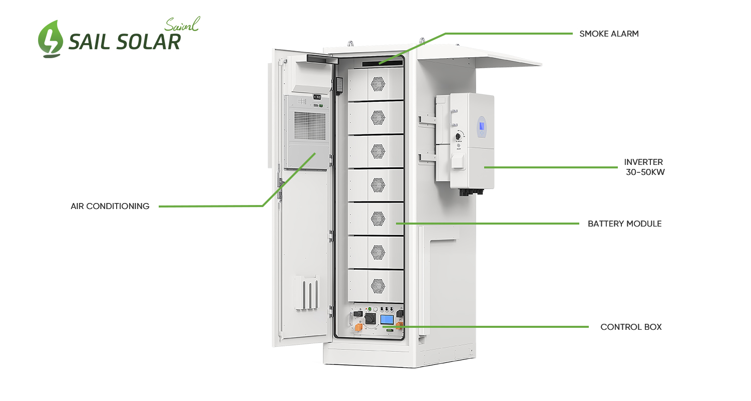 Kit complet Sail Solar 30 kW/50 kW, onduleur solaire hybride avec batterie au lithium 100 kWh, système de stockage d'énergie tout-en-un pour extérieur.