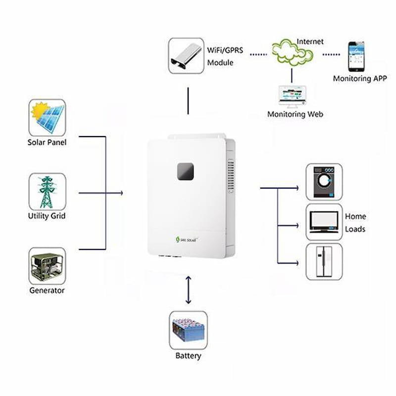 Onduleur solaire hybride monophasé 120 V/240 V SAIL SOLAR 10 kW pour système solaire